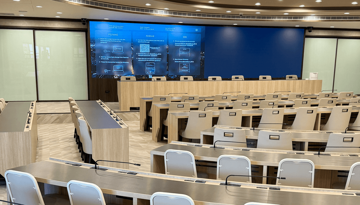 在功能性上,系統具備發言人特寫追蹤的智慧整合特色。當會議中有人啟動發言鍵,攝影機便能即時自動追蹤並鎖定發言者,將其影像放大投射至前方大型 LED 電視牆。這項功能對於大型會議、跨國視訊或線上直播特別重要,不僅能讓現場與會者清楚掌握發言者的表情與細節,更使遠端參與者如臨現場,顯著提升了互動性與參與感,讓會議過程更加專注且高效。