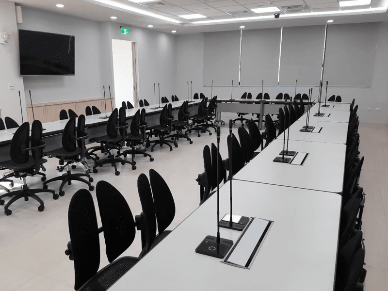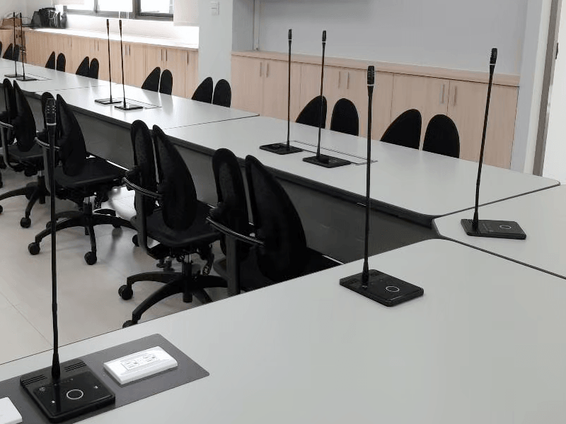 本案採用 DCS 7000 CM / DM 桌上型會議麥克風,其特色在於具備「桌上放置」與「嵌入式」兩種安裝方式,可依空間條件彈性規劃。為達到桌面俐落與整體美觀,本案選用嵌入式安裝,將麥克風單元整合進會議桌內,使桌面維持平整乾淨,同時改善線材外露與桌面凌亂問題,讓設備真正成為空間的一部分。