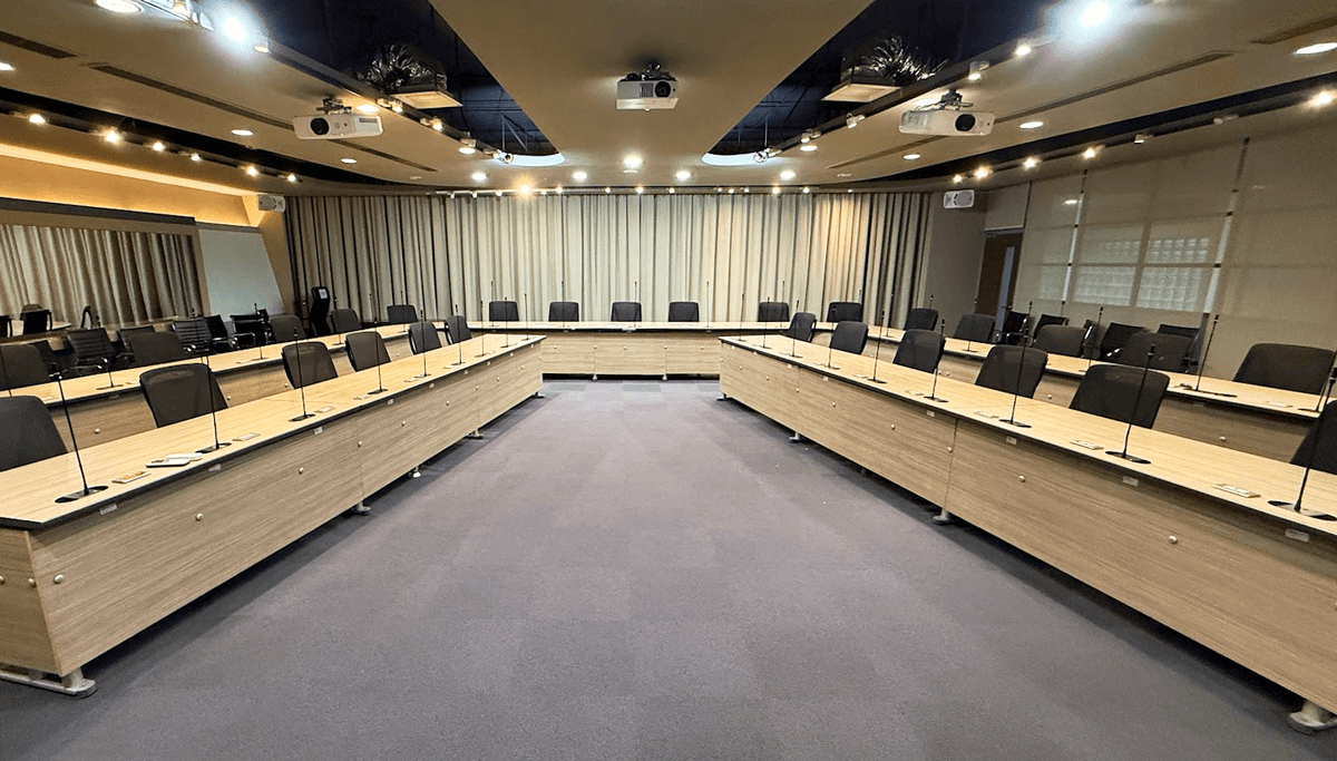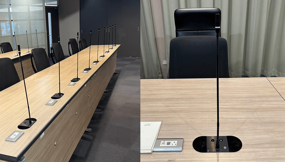在此次會議室升級專案中,最大的挑戰在於如何妥善處理桌面上原本留下的超大孔洞。為了兼顧功能與美觀,我們選用了 DCS 7000 嵌入式麥克風 作為核心設備。